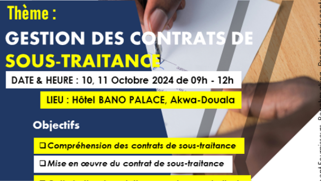 La bourse de sous-traitance et de partenariat du cameroun organise les 10 et 11 octobre prochain au profit des grandes entreprises et de ses pme/pmi une formation sur le management des contrats de sous-traitance. l’institution donnera à l’occasion l’opportunité aux participants de mettre en œuvre et gérer des contrats de sous-traitance.